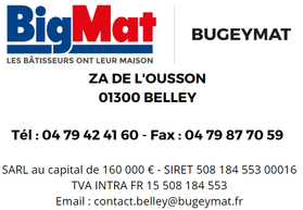 Notre magasin BigMat Bugeymat est situé dans le département de l’ Ain (01) à Belley . Nous proposons aux artisans professionnels et aux particuliers bricoleurs les matériaux de construction, les outils, l’expertise et les conseils nécessaires à la réalisation d’un projet de rénovation ou de construction neuve. Des vendeurs spécialisés vous accueillent. Nous vous livrons sur votre chantier ou à domicile avec nos camions en respectant vos délais. Contactez-nous pour des conseils techniques ou envoyez-nous une demande de devis gratuit en ligne. Nos équipes vous répondront dans les plus brefs délais. A bientôt dans votre magasin BigMat Bugeymat à Belley .