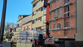 Livraison et levage de matériaux directement en façade, avec déploiement de la grue pour une mise à l’étage précise et sécurisée.