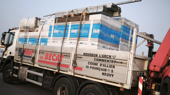 Livraison et levage de matériaux directement en façade, avec déploiement de la grue pour une mise à l’étage précise et sécurisée.